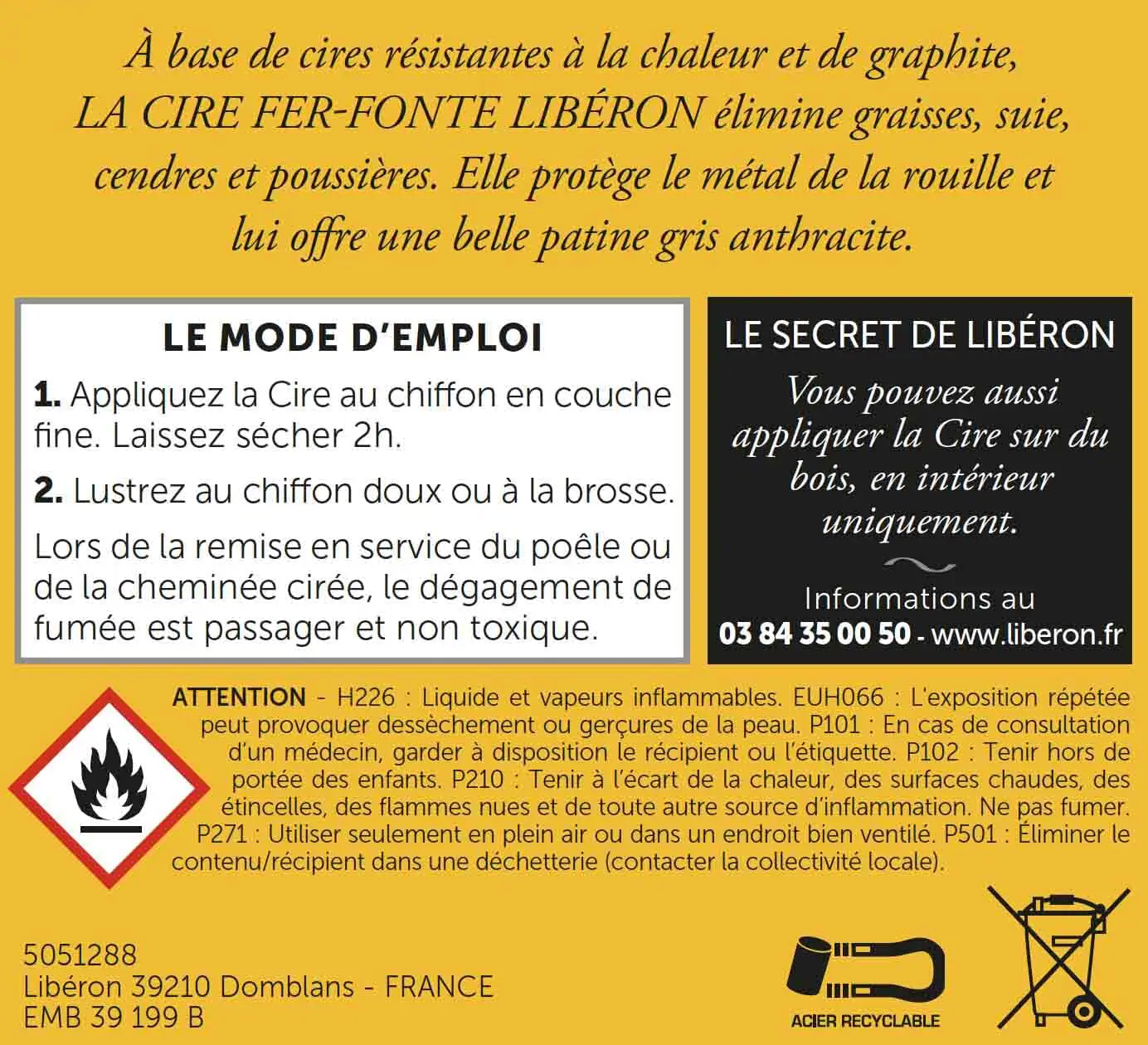 A base de résines résistantes à la chaleur et de graphite. La Cire Nourrissante Fer-Fonte de Libéron protège de la rouille et résiste à la chaleur. Elle sublimera également vos supports d’une patine gris anthracite.