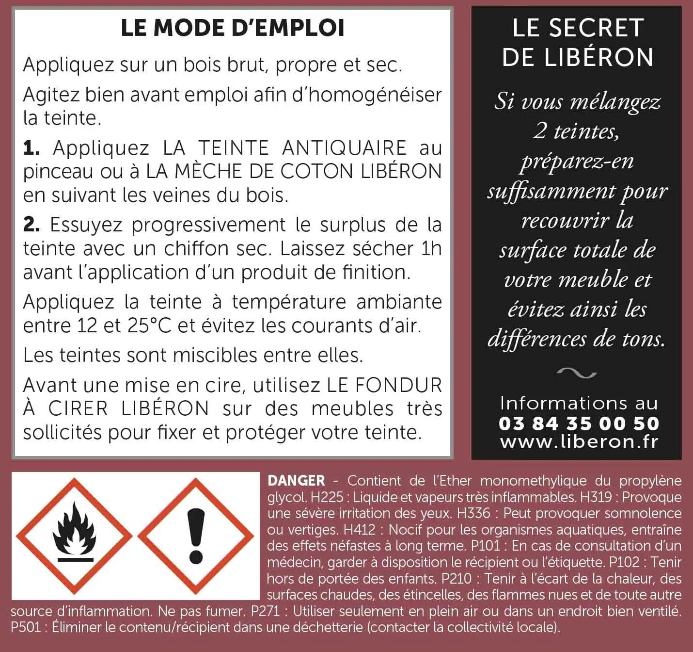 Les teintes sont miscibles entre elles. Avant une mise en cire, utilisez Le Fondur À Cirer Libéron sur des meubles très sollicités pour fixer et protéger votre teinte.