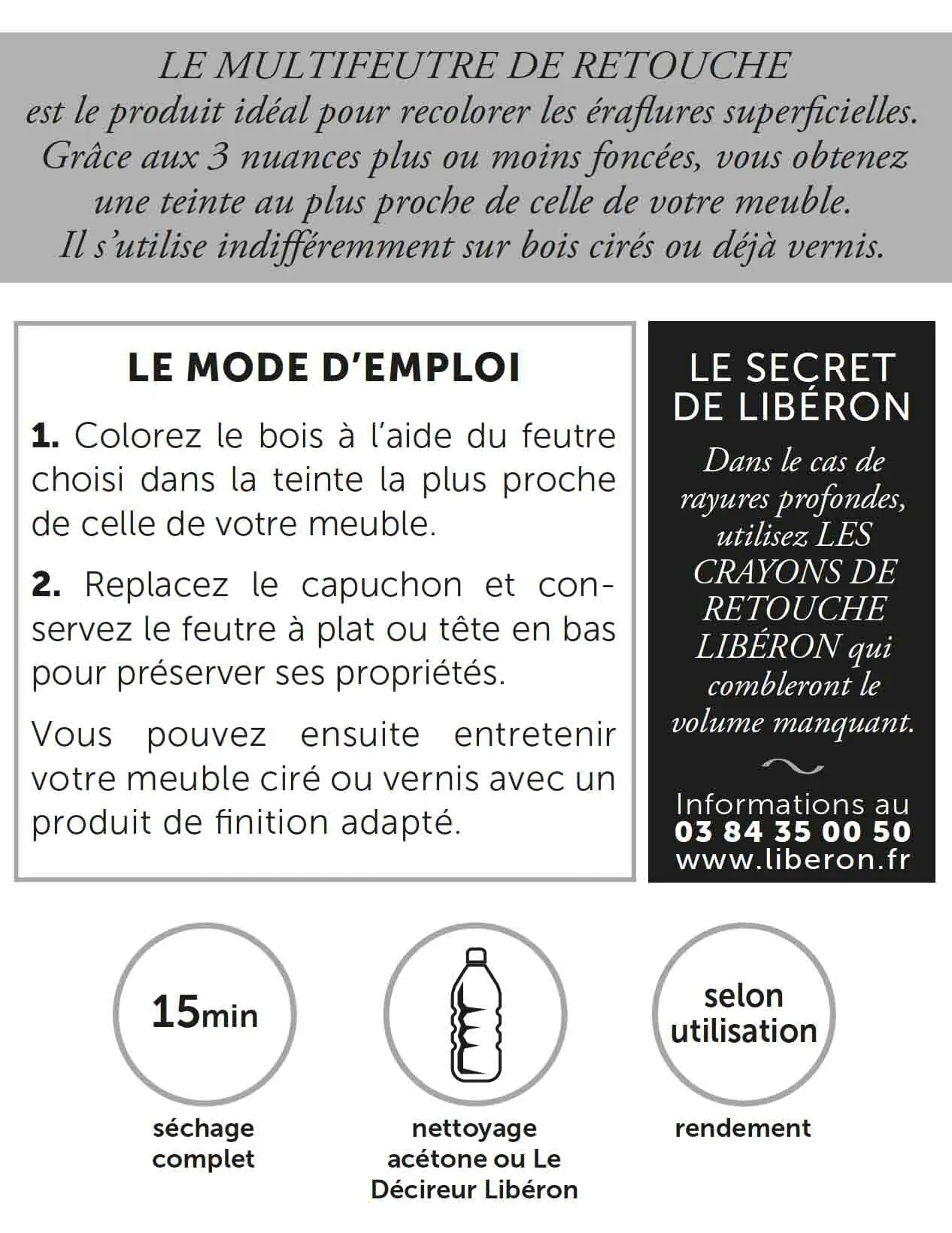 Le Multifeutre de retouche est le produit idéal pour recolorer les éraflures superficielles. Grâce aux 3 nuances plus ou moins foncées, vous obtenez une teinte au plus proche de celle de votre meuble. Il s’utilise indifféremment sur bois cirés ou déjà vernis.