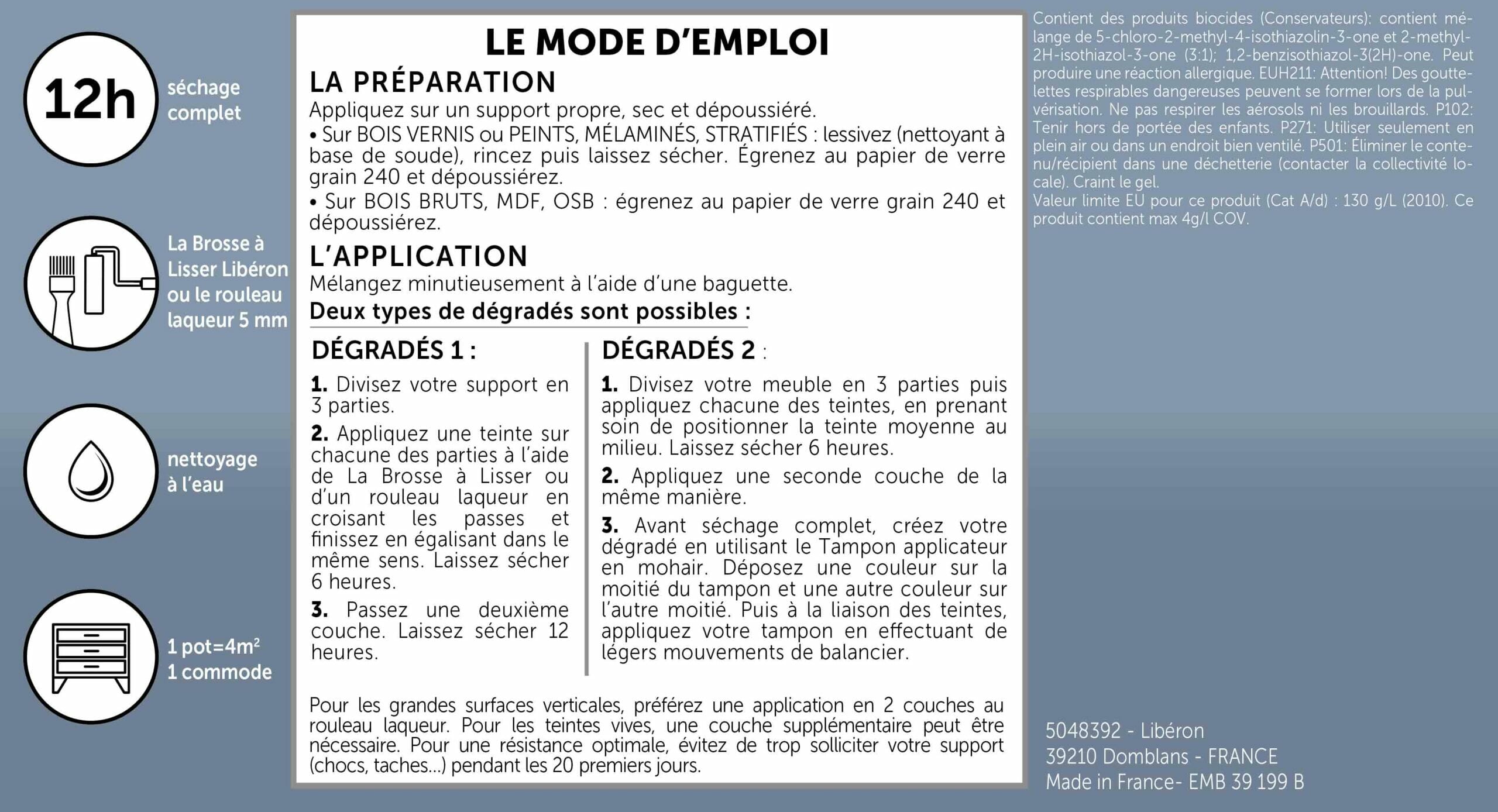Nous recommandons d’appliquer, pour une meilleure résistance, protection contre les tâches, chocs… la Protection Surfaces Peintes Incolore satinée en 2 couches.