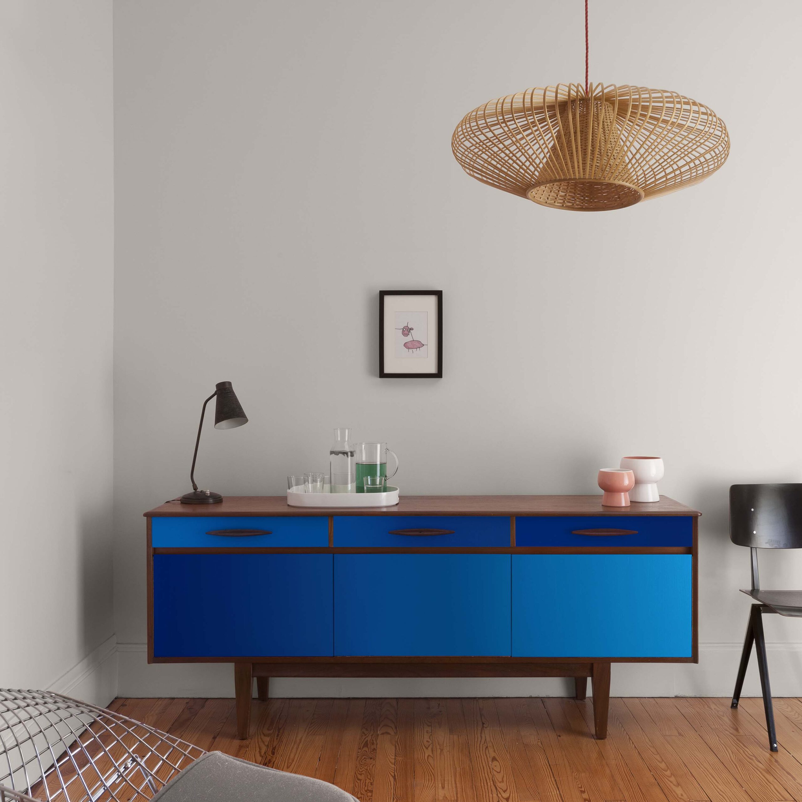 - Divisez votre meuble en 3 parties puis appliquez chacune des teintes, en prenant soin de positionner la teinte moyenne au milieu. Laissez sécher 6 heures.