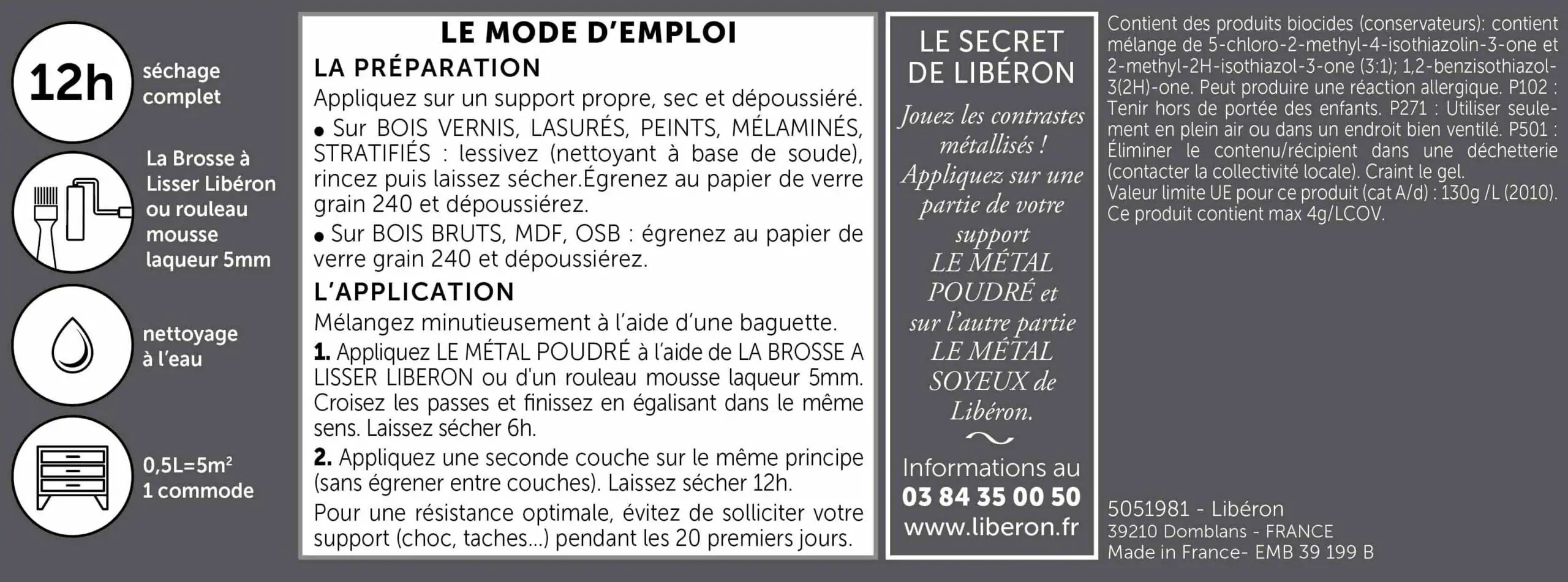 La peinture Métal Soyeux, Métal Poudré ou Métal Absolu Libéron doit être appliquée en couche suffisamment épaisse afin d’obtenir la bonne couleur finale.