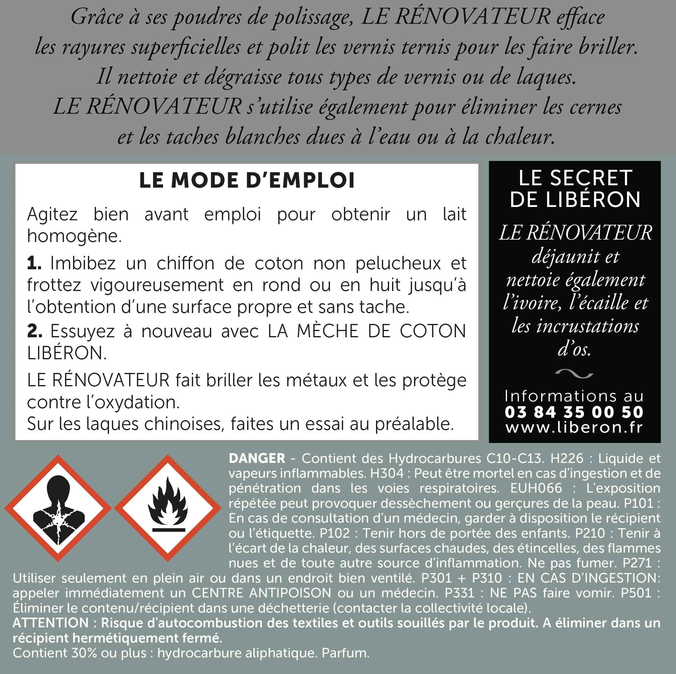 Grâce à ses poudres de polissage, Le Rénovateur enlève les rayures superficielles et polit les vernis ternis pour les faire briller. Il nettoie et dégraisse tous types de vernis ou de laques. Le Rénovateur s’utilise également pour éliminer les cernes et les taches blanches dues à l’eau ou à la chaleur.
