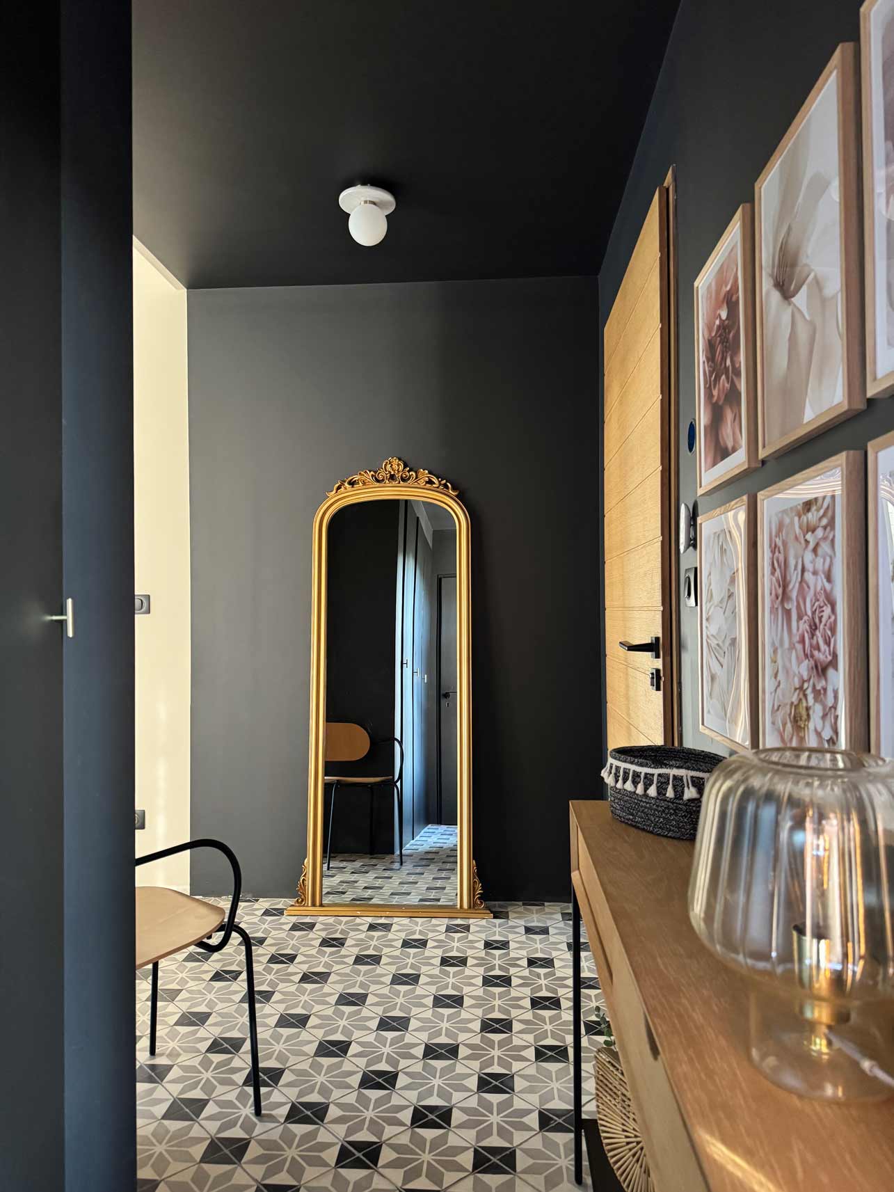 Aurélie a osé le pari des teintes profondes avec le Noir Smoking – Velours de peinture ® qui habille les murs de son entrée.